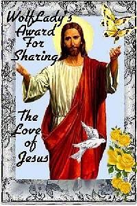 ![]() WolfLady's Award For Sharing The Love Of Jesus Website |